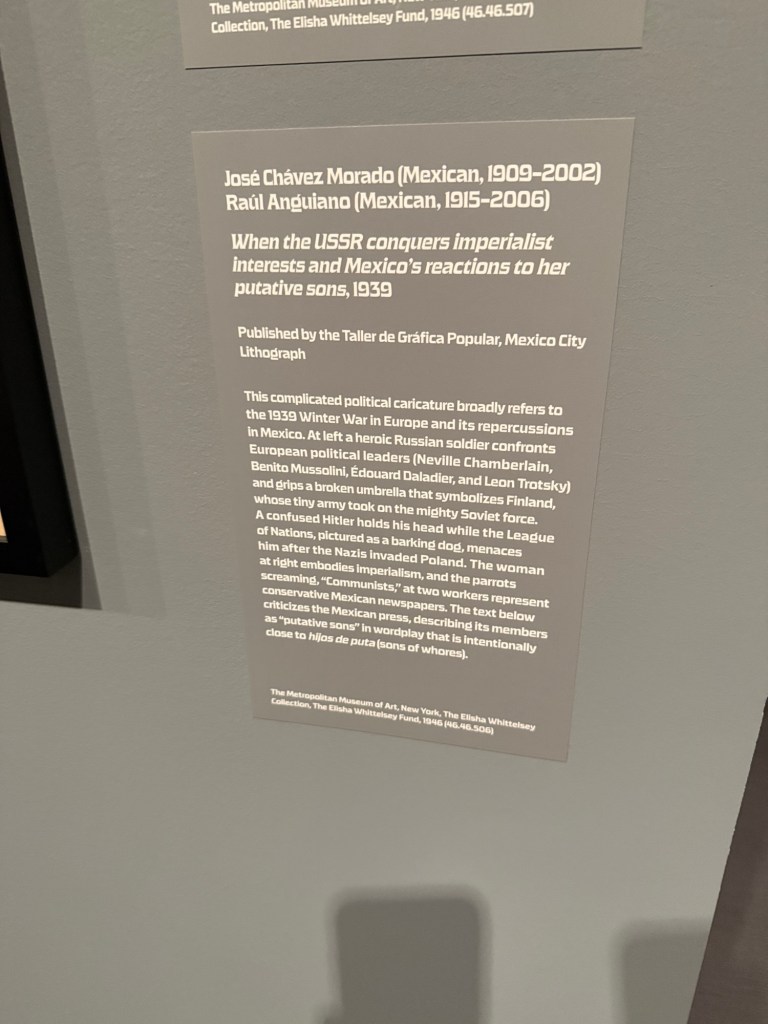 First stop a wonderful exhibition of graphic art set by the Mexican artists right after the revolution of 1910 a revolution that continued probably to this day many political cartoons wood cuts those etc. etc.