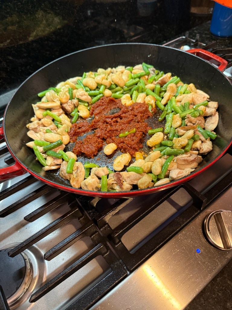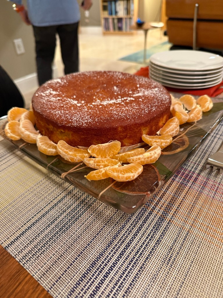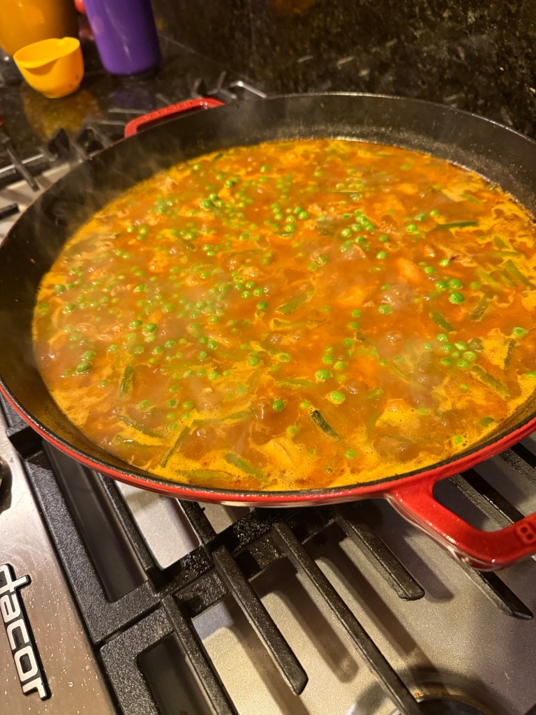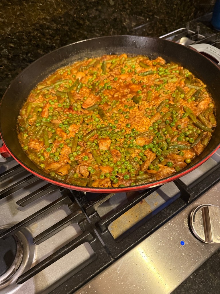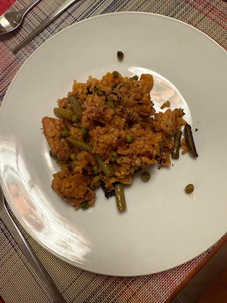 Lovely, paella, dinner, champagne, Albarino, wine, Rioja wine, Simon and Narit and a fine orange cake