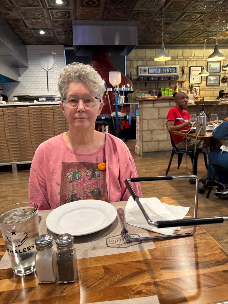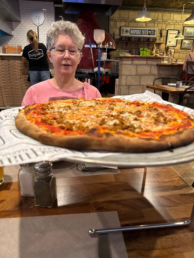 Some fine pizza at Pasquale’s for dinner. Some of it went splat and they made us another pizza. Great service.