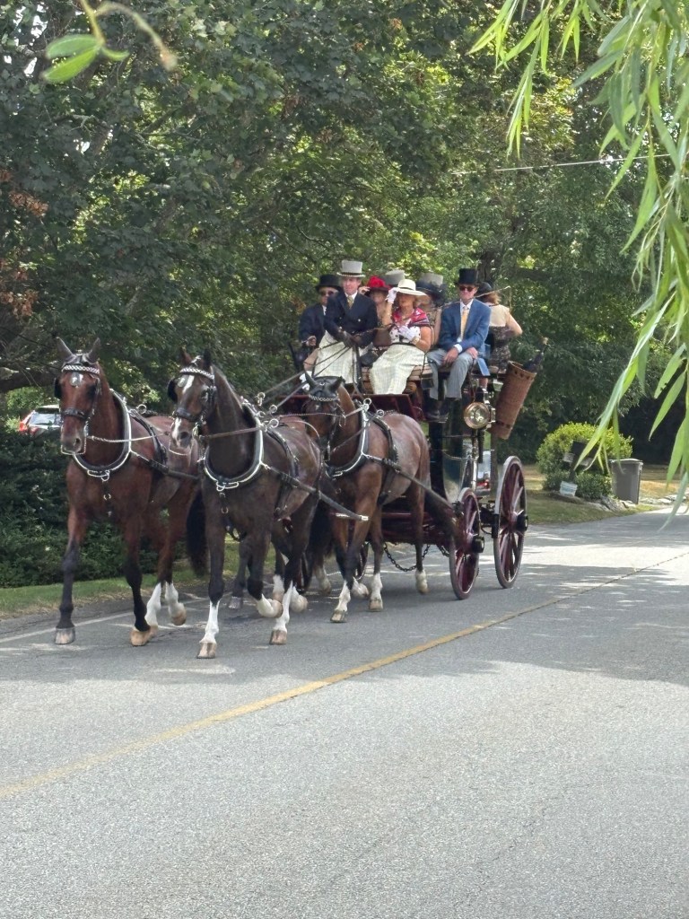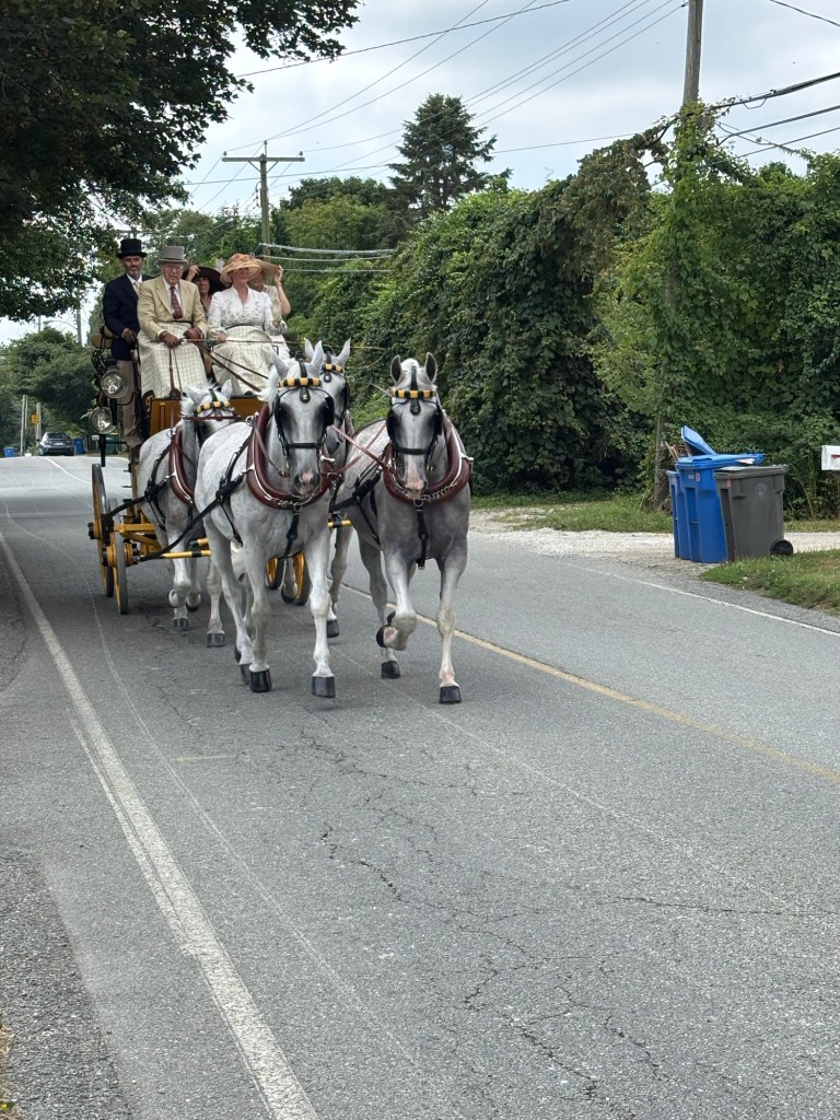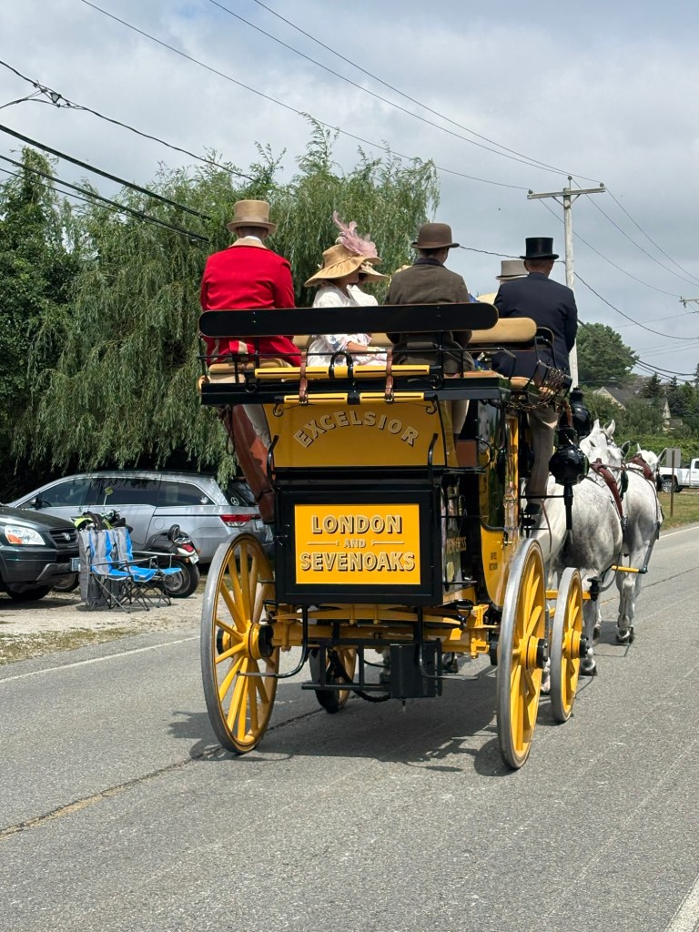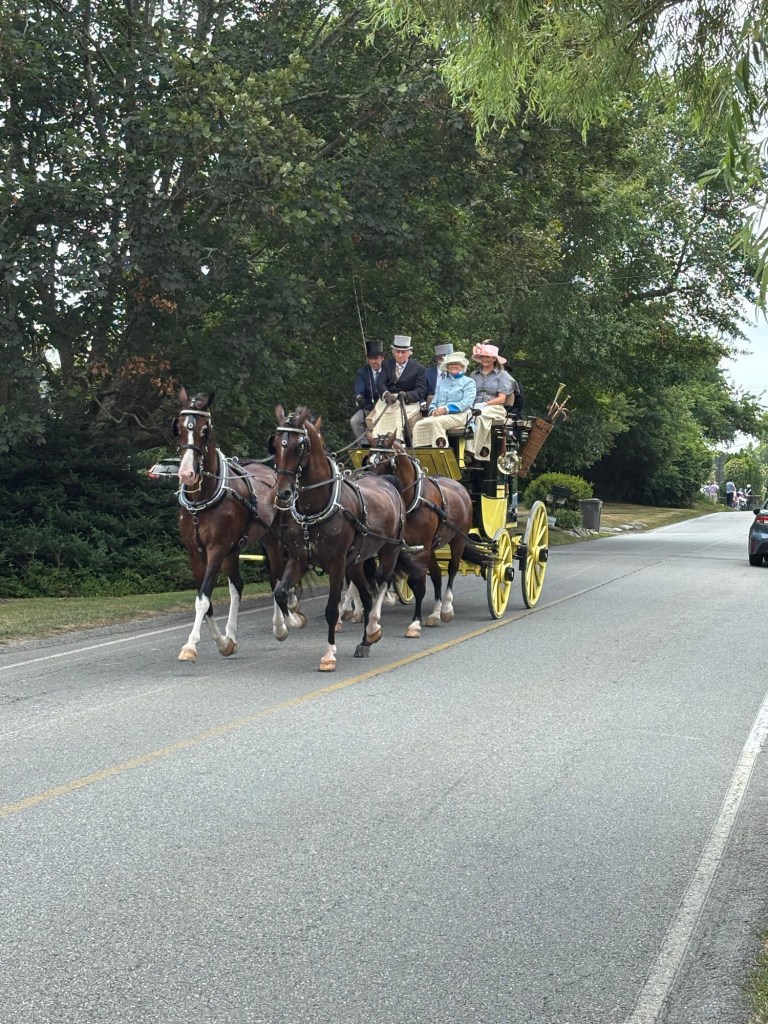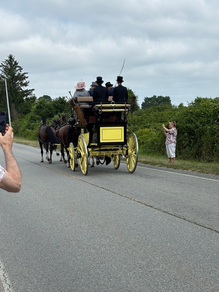 Weekend event in Newport and the rest of the island. Each day coaches and four plus period dressed passengers drive a different path through the island. Today (Friday) the course came along Wapping Road. We thought that would be the closest and least crowded viewing spot. We called Greg of Rocky Brook Orchard to ask if we could park on his lot. He kindly gave permission (note: the orchard will open in about 2 weeks).