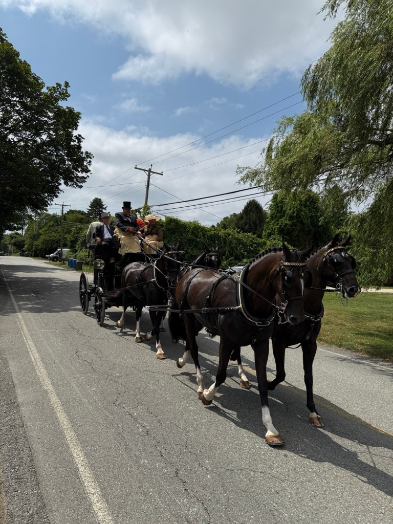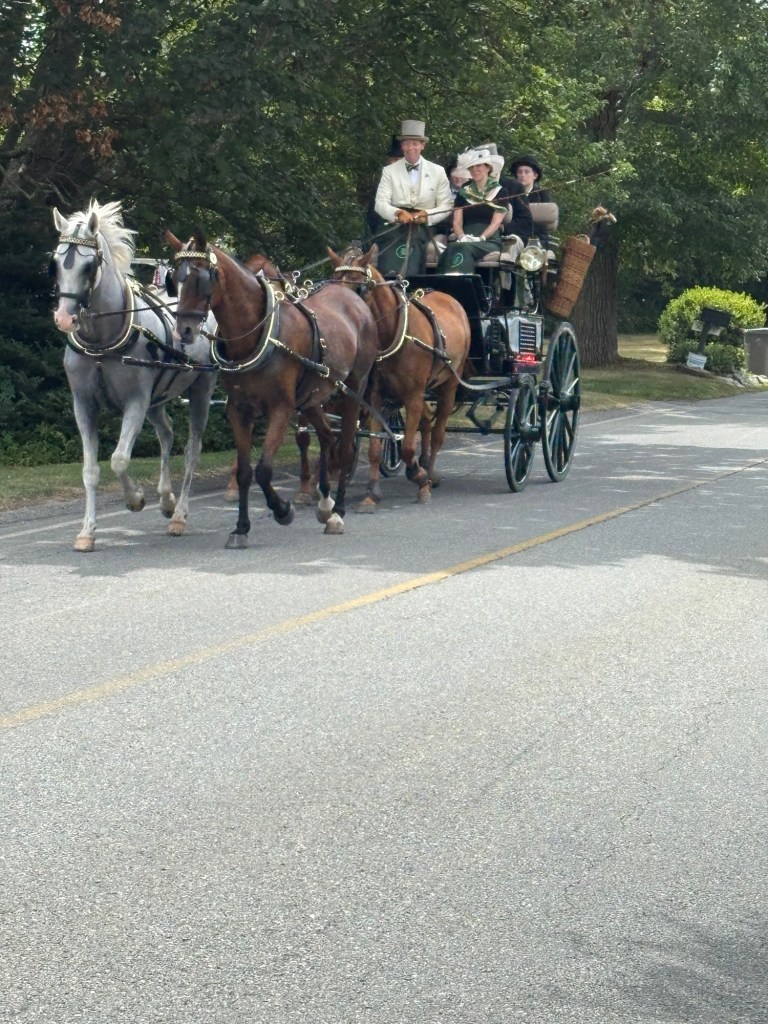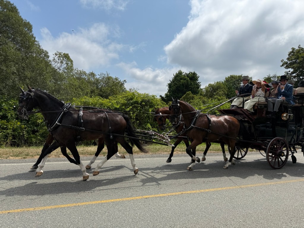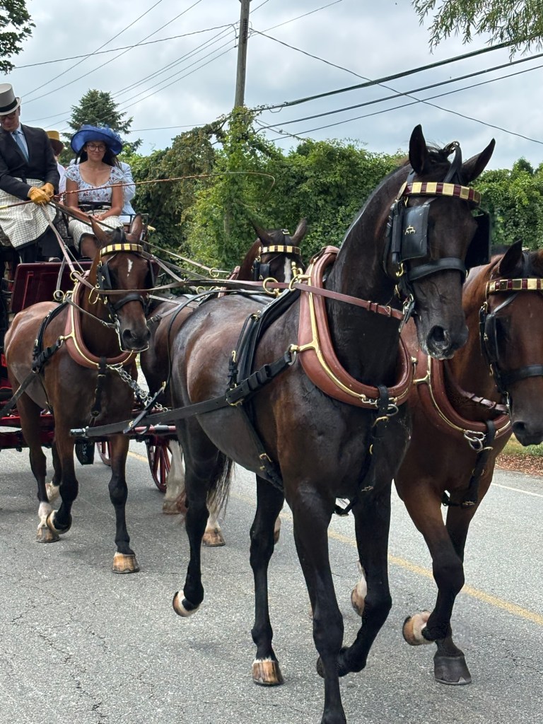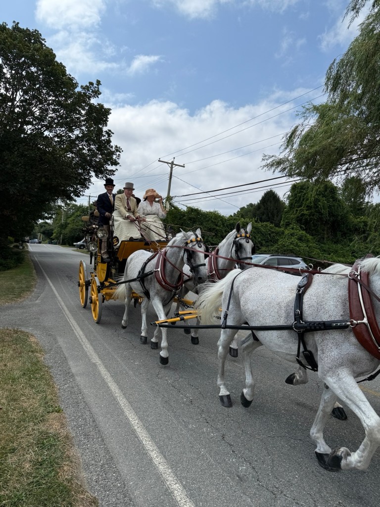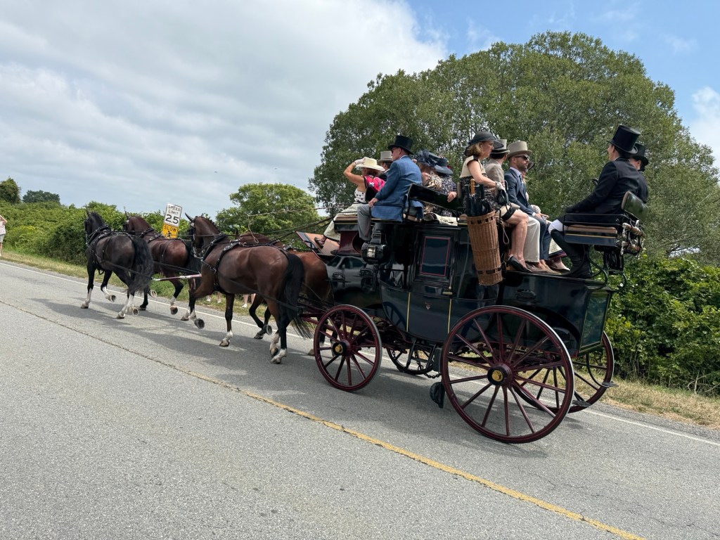 Weekend event in Newport and the rest of the island. Each day coaches and four plus period dressed passengers drive a different path through the island. Today (Friday) the course came along Wapping Road. We thought that would be the closest and least crowded viewing spot. We called Greg of Rocky Brook Orchard to ask if we could park on his lot. He kindly gave permission (note: the orchard will open in about 2 weeks).