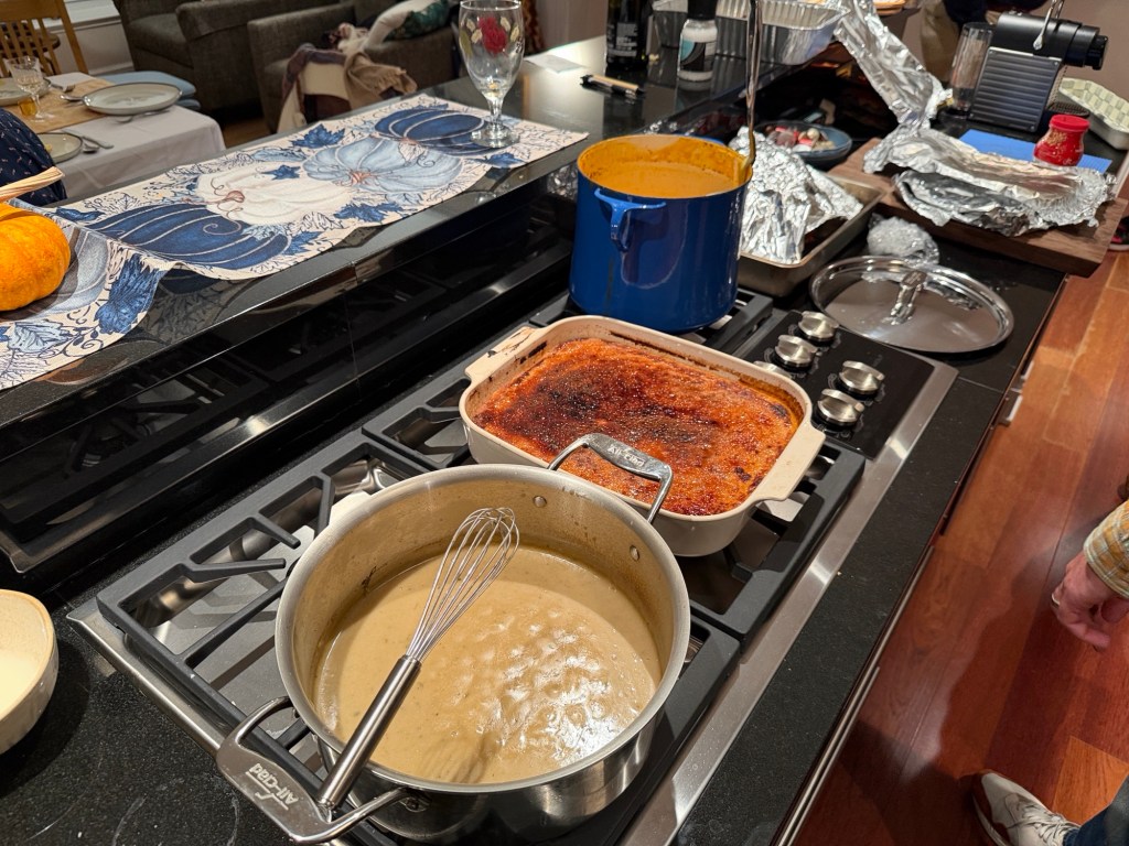 Gravy, soup, sweet potato brûlée